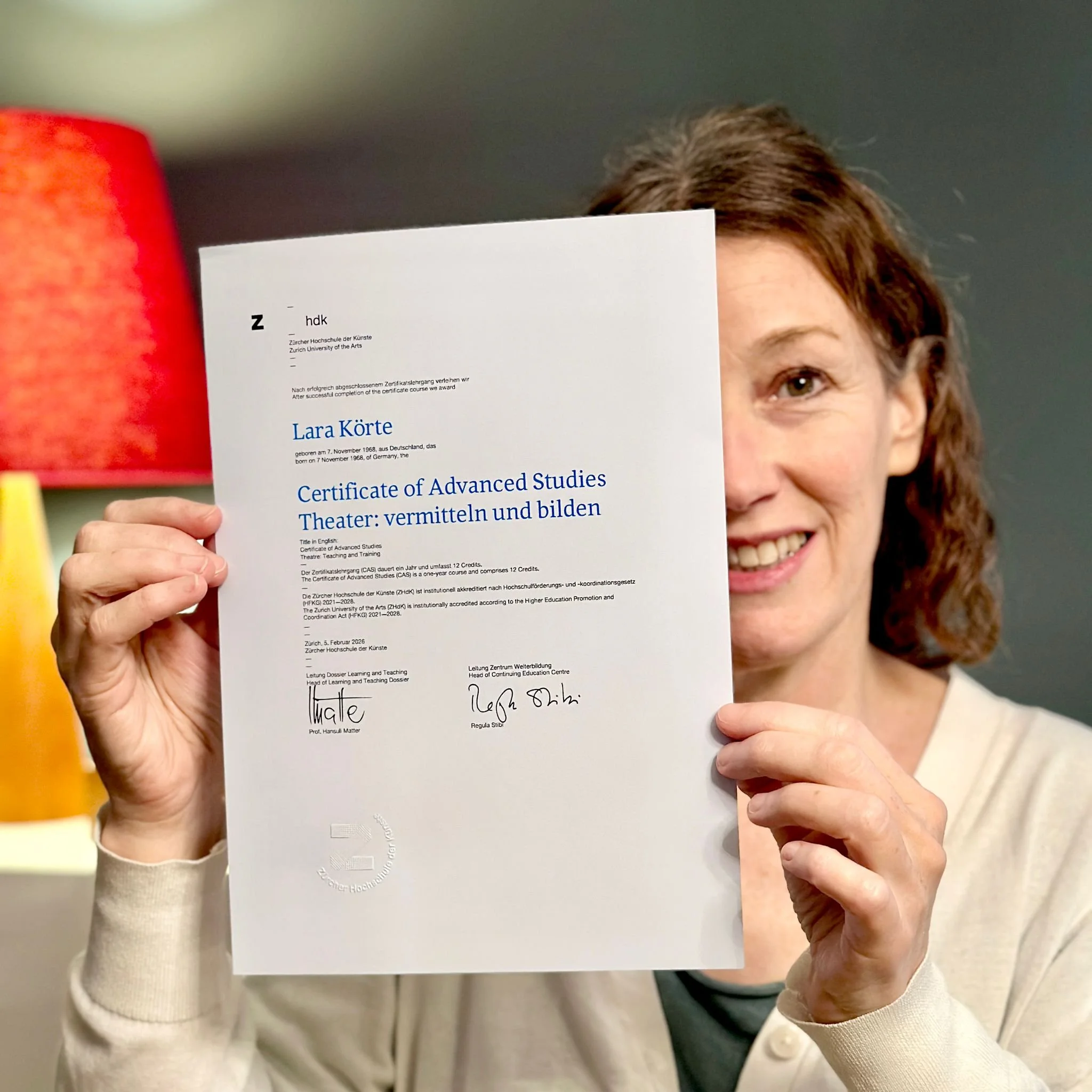 Lara Körte February 26, 2026 Ich freue mich, meine Weiterbildung CAS in Theater: vermitteln und bilden an der ZHDK, abgeschlossen zu haben! Lara Körte February 26, 2026
